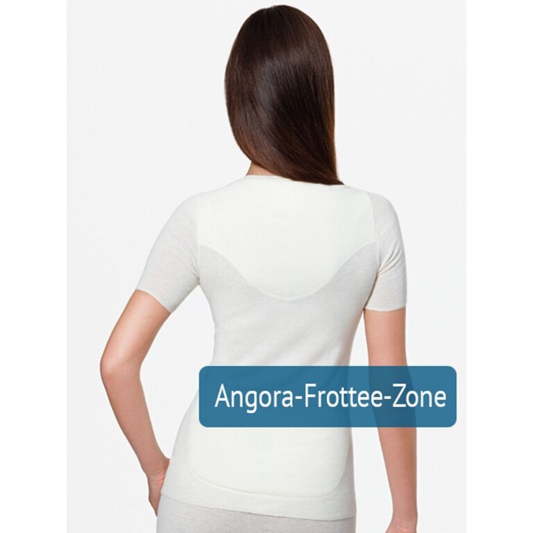 - w tej damskiej koszulce z 20% najdelikatniejszej angory w szczególności wrażliwe partie w okolicy karku i ramion, a także w okolicy nerek i kręgów lędźwiowych zostały dodatkowo wzmocnione miękką strefą z angorowego frotte.