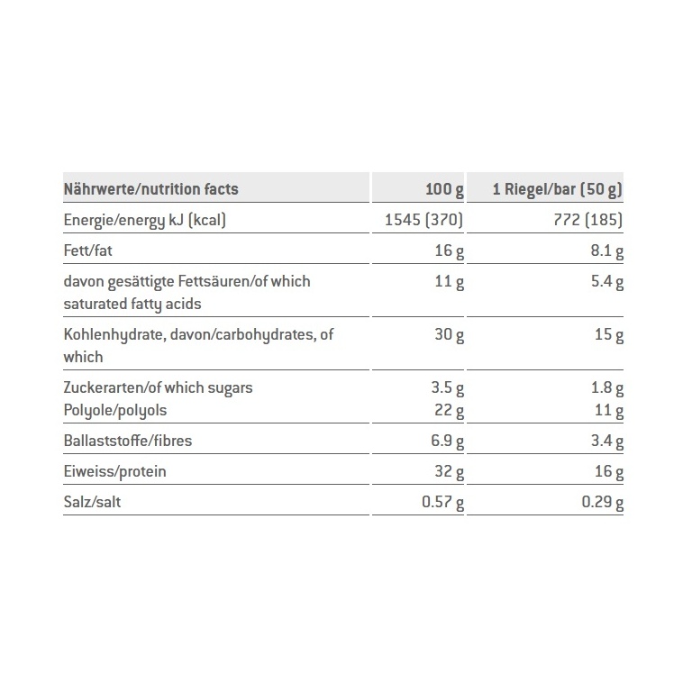 - Składniki: Biała czekolada z substancją słodzącą 31% (substancja słodząca maltitol, masło kakaowe, mleko w proszku, emulgator lecytyna słonecznikowa, aromat), warstwa karmelowa o smaku malinowym 16% (polidekstroza [błonnik pokarmowy], mleko skondensowane, masło kakaowe, kwas cytrynowy, substancja nawilżająca sorbit, emulgator lecytyna słonecznikowa, aromaty, sól, barwnik karminowy), białko mleczne, chrupki sojowe 9% (białko sojowe, mąka ryżowa, ekstrakt słodu jęczmiennego, sól), hydrolizat kolagenu, substancja nawilżająca glicerol, białko sojowe, tłuszcz kokosowy, granulat malinowy 0.6%, aromaty, sól, olej słonecznikowy, substancja słodząca sukraloza. Może zawierać śladowe ilości jaj, orzechów i orzeszków ziemnych