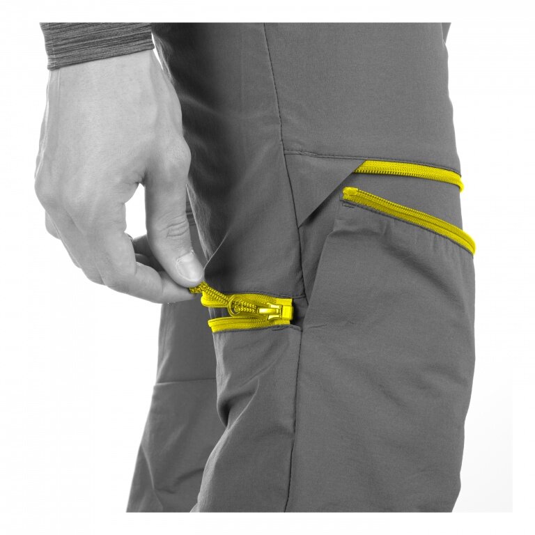 - wąska, prosta nogawka, ergonomiczny pas oraz wstępnie uformowane kolana wspierają podczas aktywności w wymagającym terenie i zapewniają nieograniczoną swobodę ruchów
