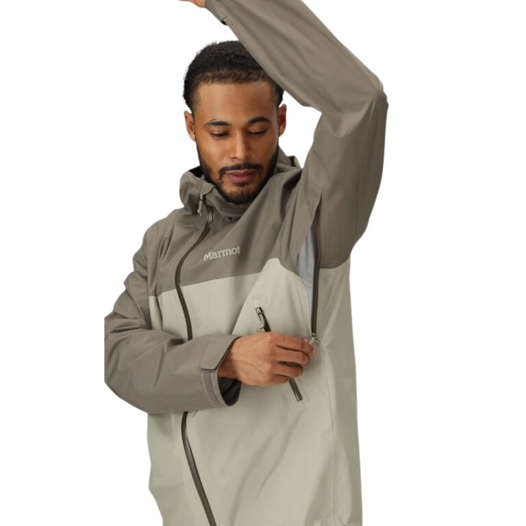 - kieszenie są umieszczone w taki sposób, aby były łatwo dostępne, gdy nosisz pas biodrowy lub uprząż wspinaczkową, a zamki błyskawiczne w okolicy pach pozwalają na ucieczkę ciepła, abyś nie pocił się podczas deszczu i długich wędrówek.