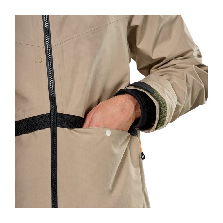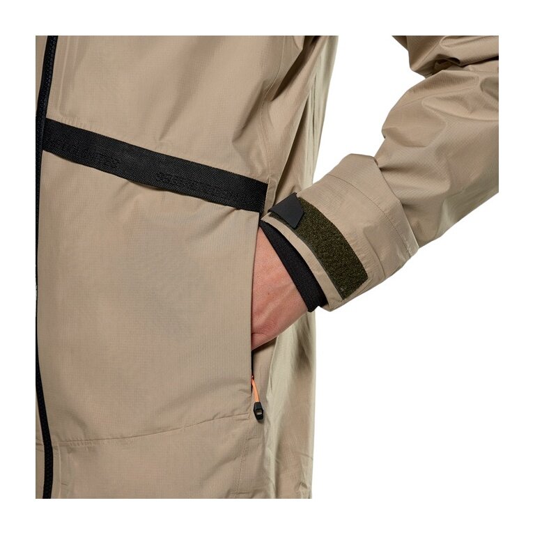 - wodoodporna kurtka ma całkowicie regulowany kaptur, a wystarczającą ilość miejsca zapewniają dwie kieszenie zewnętrzne z oddzielnymi przegrodami: górne zamykane są na zatrzask, a boczne na zamek błyskawiczny, aby telefon lub klucze były bezpiecznie przechowywane