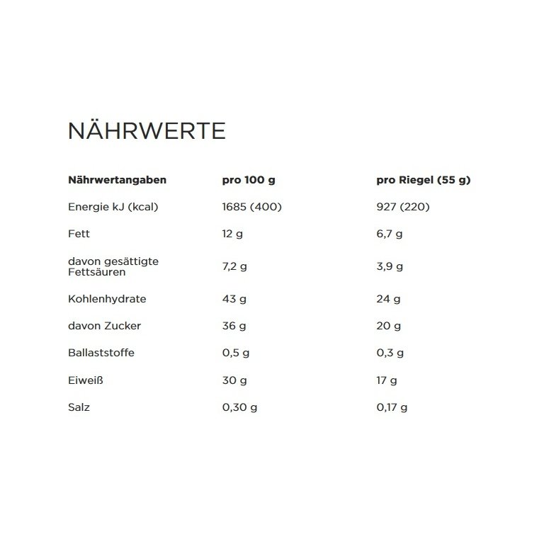 • Skład: Białko mleczne (24%), syrop glukozowy, polewa czekoladowa z pełnego mleka (20%) [cukier, masło kakaowe, mleko w proszku, masa kakaowa, emulgator (lecytyna sojowa), aromat], nadzienie karmelowe (13,5%) [syrop glukozowy, tłuszcz palmowy, cukier, słodzone mleko odtłuszczone w proszku, dekstroza, emulgator (lecytyna sojowa), olej rzepakowy (całkowicie utwardzony), sól, naturalny aromat], syrop glukozowy, białko serwatkowe (mleko) (5%), chrupki sojowe (5%) [białko sojowe, skrobia, sól], substancja utrzymująca wilgoć (gliceryna), aromat, emulgator (lecytyna sojowa)