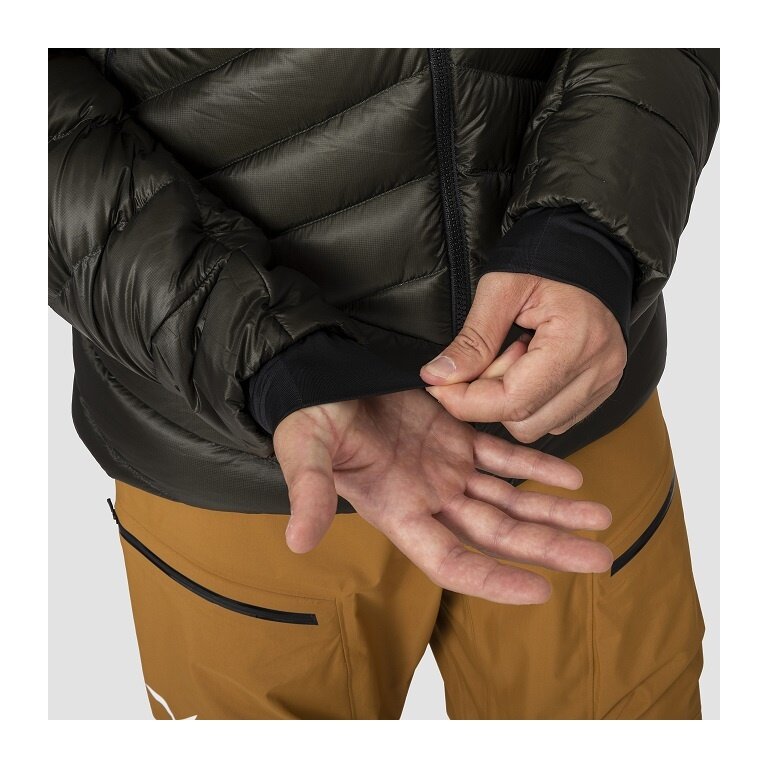 - puch gęsi jest certyfikowany zgodnie z Responsible Down Standard i zapewnia ciepło przy współczynniku sprężystości 750 Cuin, nawet w mroźne dni. Materiał TirolWool® Responsive ogrzewa również, gdy jest mokry – dlatego jest używany w kapturze, na ramionach oraz przy mankietach