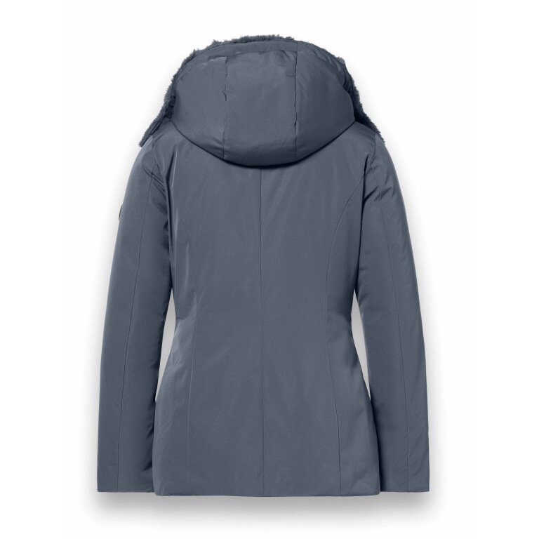 • funkcjonalna kurtka o średniej długości z odpinanym, regulowanym kapturem i kołnierzem wyłożonym sztucznym futrem.