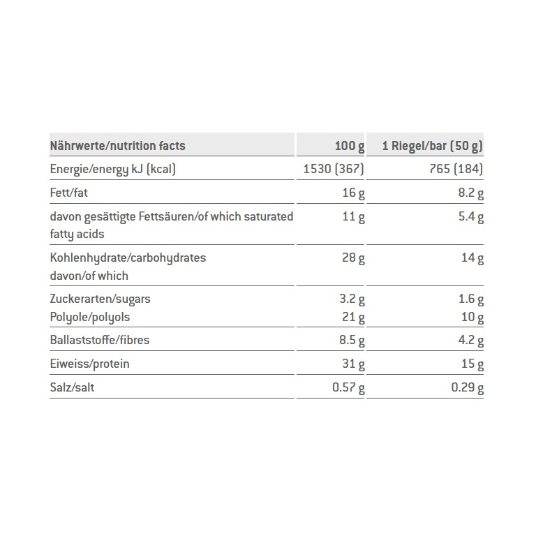 - Składniki: polewa z mlecznej czekolady z substancją słodzącą 31% (substancja słodząca maltitol, masło kakaowe, mleko w proszku, masa kakaowa, emulgator lecytyna sojowa, aromat), warstwa karmelowa 18% (polidekstroza [błonnik pokarmowy], mleko skondensowane, masło kakaowe, substancja utrzymująca wilgoć sorbit, emulgator mono- i diglicerydy kwasów tłuszczowych, aromat, sól, barwnik karmelowy), białko mleczne, hydrolizat kolagenu, chrupki sojowe 9% (białko sojowe, mąka ryżowa, ekstrakt słodu jęczmiennego, sól), substancja utrzymująca wilgoć glicerol, białko sojowe, tłuszcz kokosowy, aromat, odtłuszczone kakao, olej słonecznikowy. Może zawierać śladowe ilości jaj, orzechów i orzeszków ziemnych