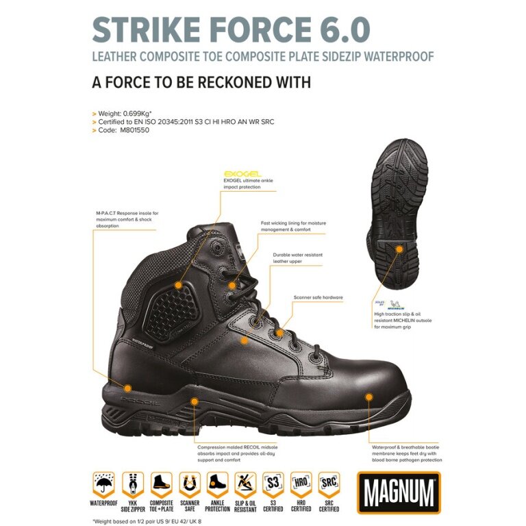 Buty robocze Magnum Strike Force 6.0 WP skórzane (wodoodporne, z bocznym zamkiem) z kompozytowym noskiem i wkładką czarne męskie