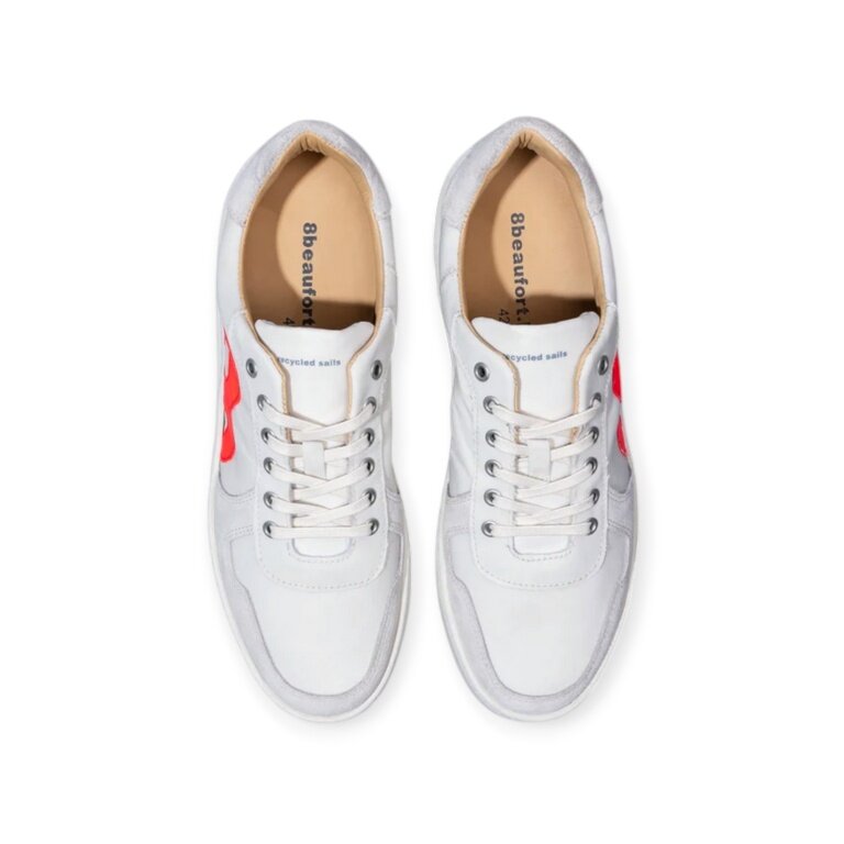 - białe sneakersy od 8beaufort.Hamburg, wykonane z recyklingowego płótna żaglowego, z podszewką z roślinnego i chromowo wolnego skóry oraz bawełny.