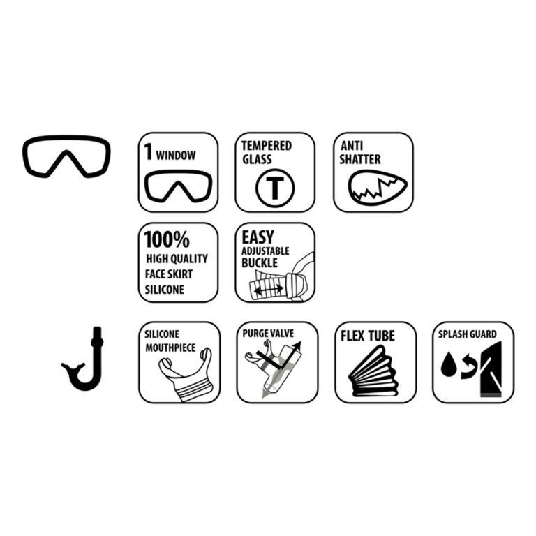 - Rurka do snorkelingu: z wysokiej jakości silikonu, zawór do wydmuchiwania, elastyczna rurka do snorkelingu, ochrona przed zachlapaniem w wyraźnym neonowym pomarańczowym kolorze, regulowany uchwyt do snorkelingu Easy Clip. Semi-Dry Top