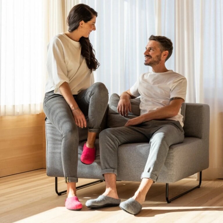 - ten wygodny filcowy kapcie dla kobiet, mężczyzn i w niektórych kolorach dla dzieci jest ręcznie produkowany w naszej manufakturze w austriackich Alpach