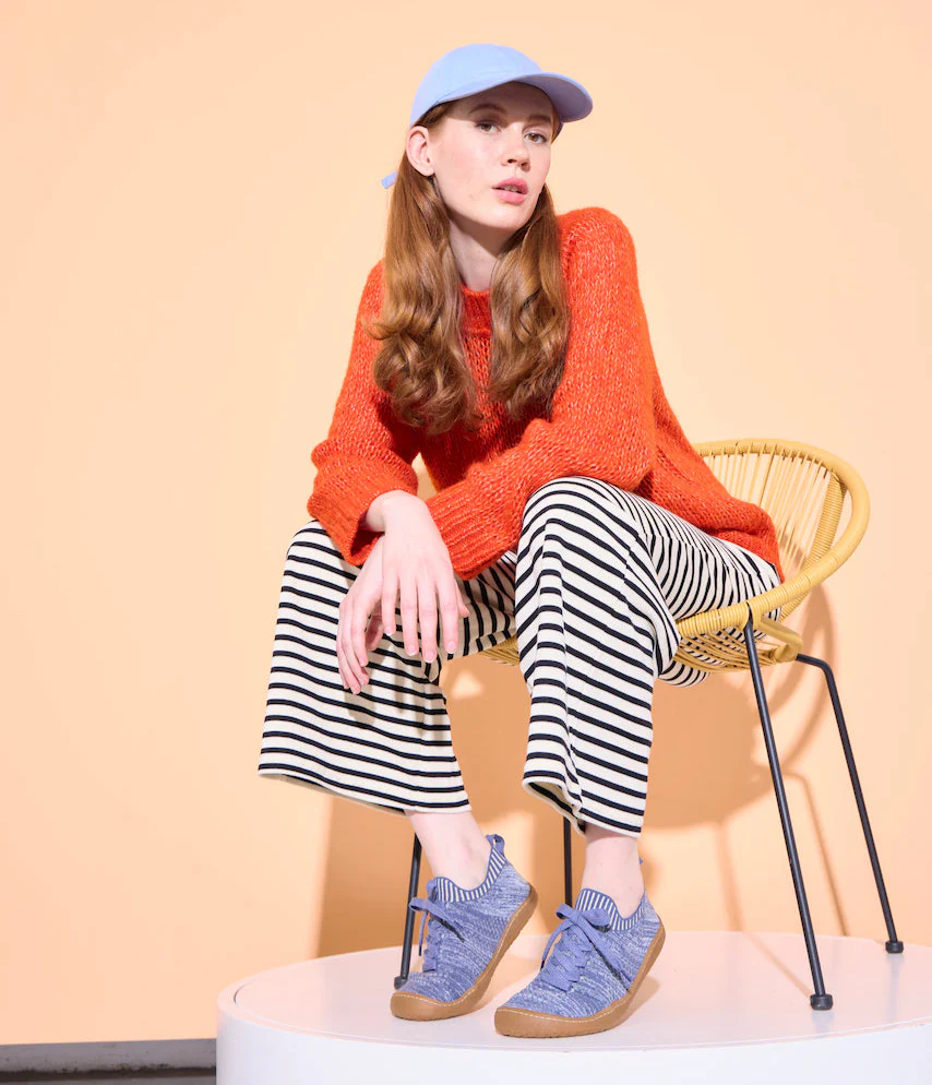 - rezultatem jest materiał wierzchni przypominający skarpetę, który idealnie dopasowuje się do stopy i umożliwia elastyczne, lekkie chodzenie z czysto naturalnych materiałów - konopi i Tencelu.