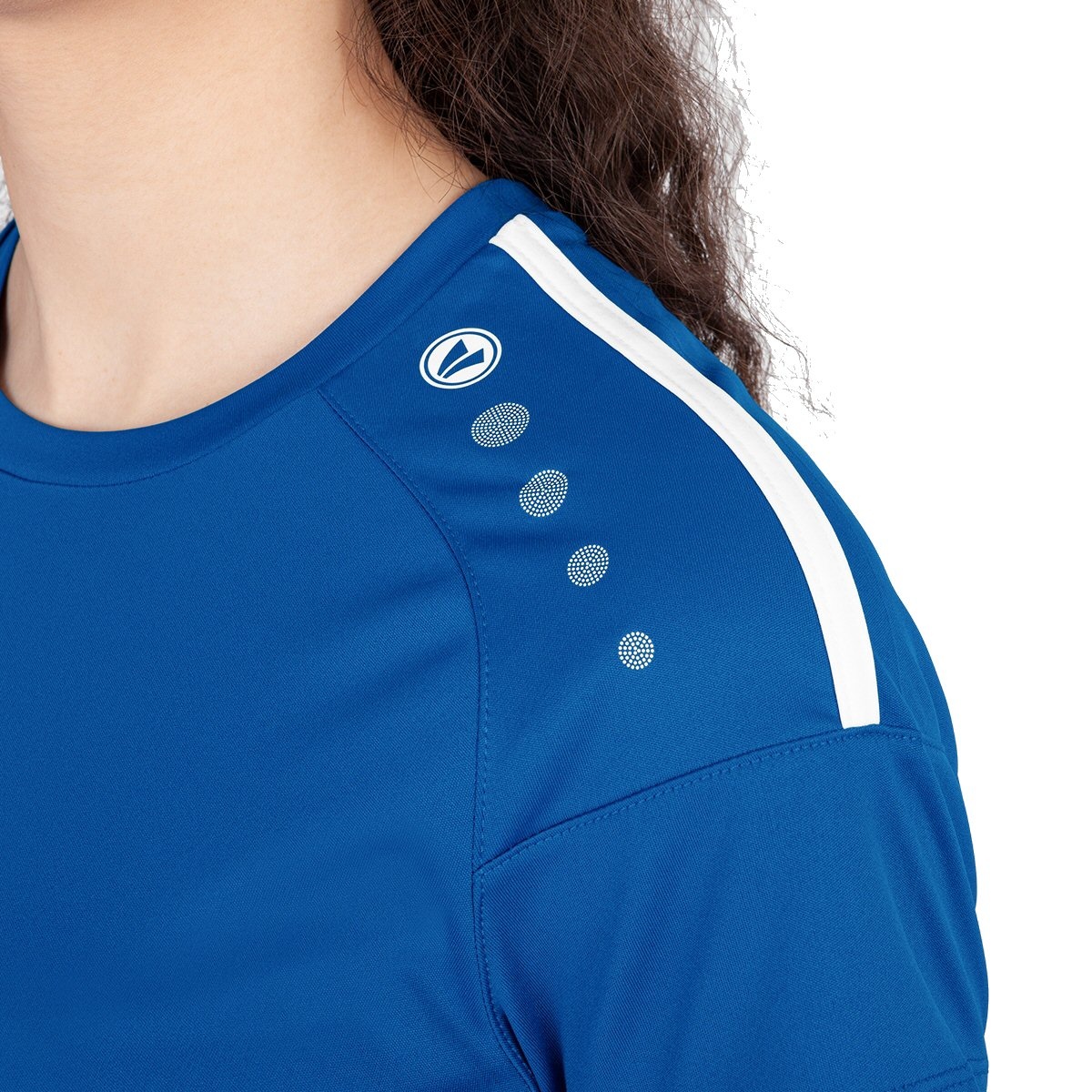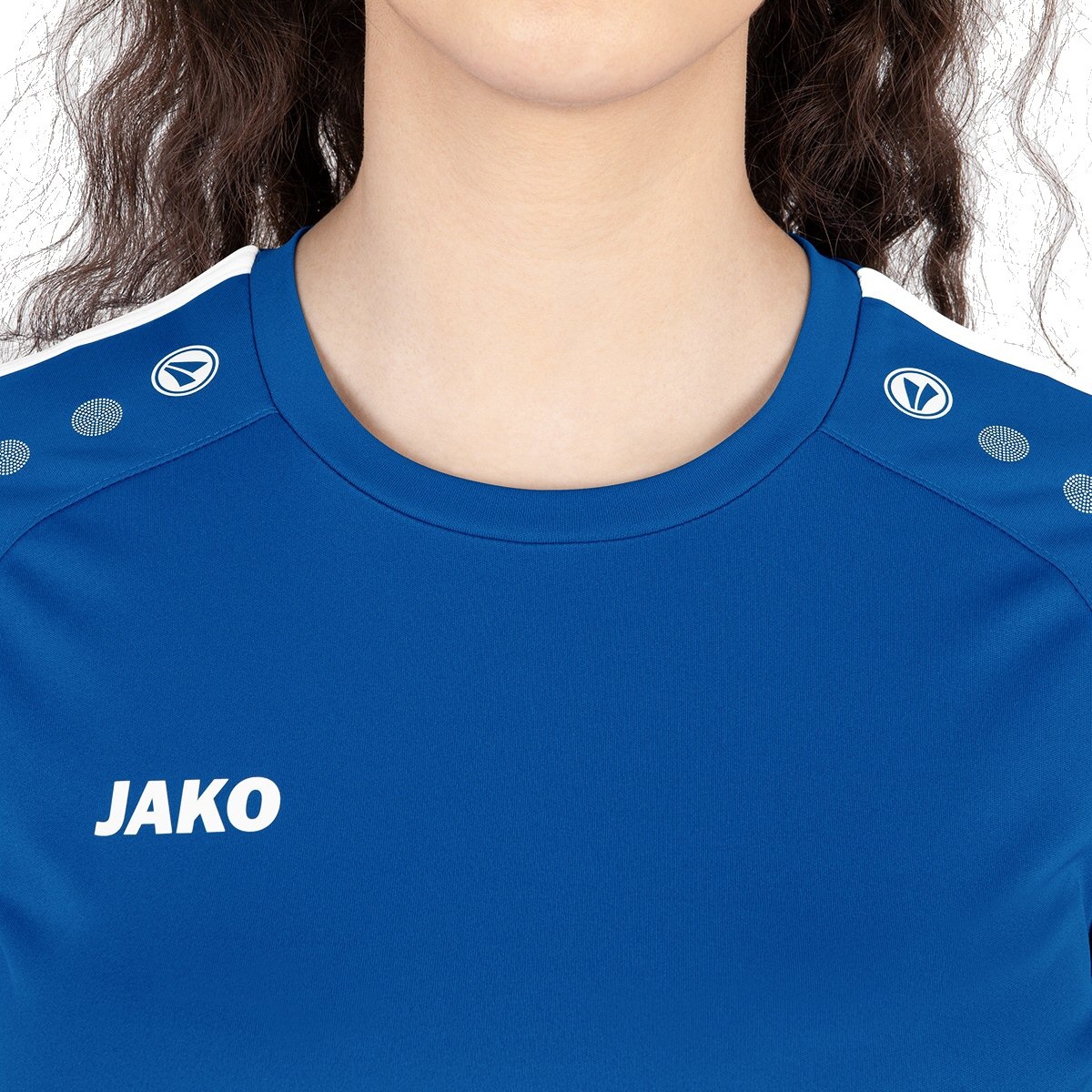• na koszulce z okrągłym dekoltem linii widać charakterystyczny kontrastowy pasek w połączeniu z kropkami JAKO w okolicy rękawów i ramion