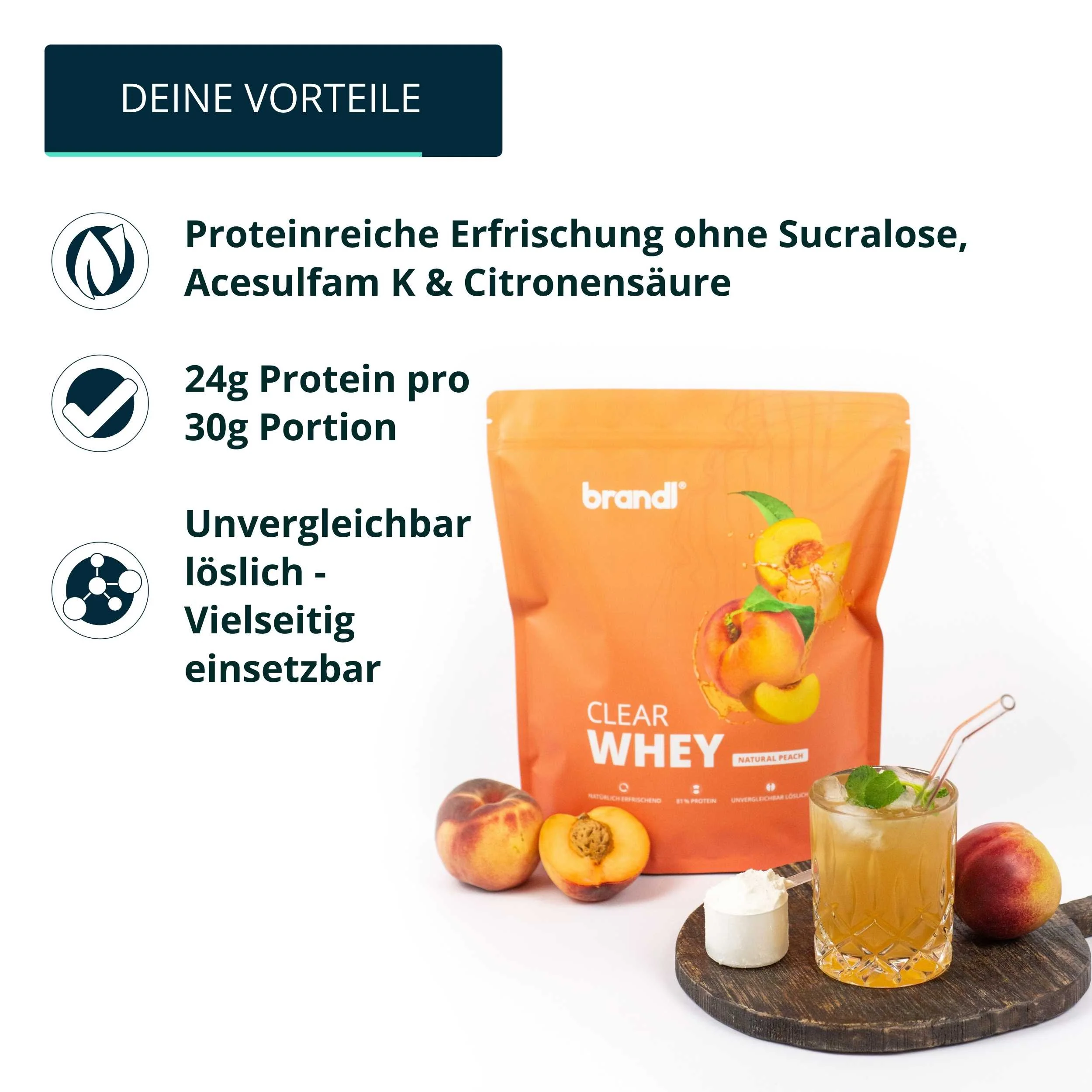 • z kuszącymi smakami Cherry Splash, Green Apple, Mango Maracuja i Natural Peach, Clear Whey marki brandl® oferuje unikalną różnorodność dla twojej przyjemności. Białka odgrywają kluczową rolę dla osób dbających o zdrowie: przyczyniają się nie tylko do wzrostu masy mięśniowej, ale także do utrzymania masy mięśniowej i zdrowych kości