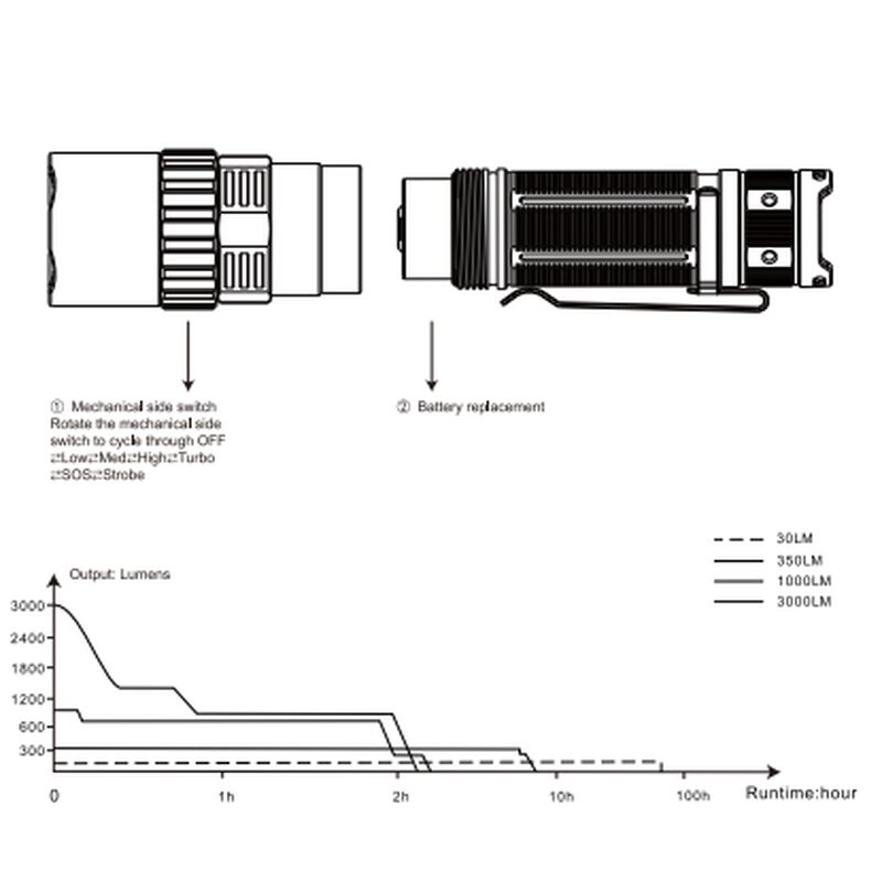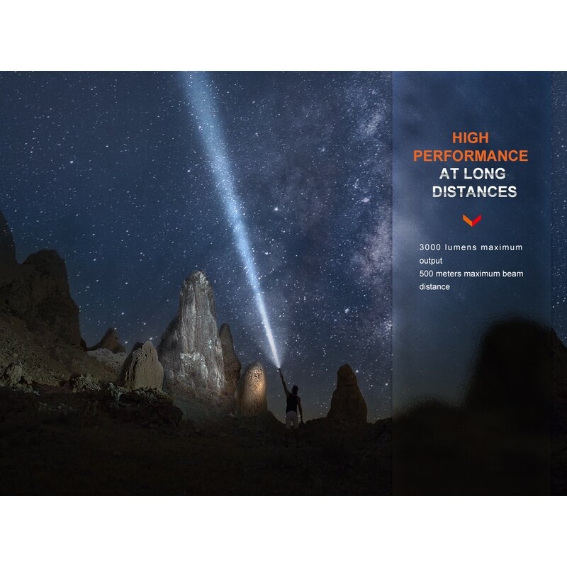 • Uwaga: Wcześniej podane wartości zostały określone w laboratorium przy użyciu akumulatora Fenix ARB-L21-5000 V2.0 LiIon i mogą się różnić w zależności od latarki, akumulatora i otoczenia. Poziom jasności „Turbo” mierzony jest z uwzględnieniem ochrony przed przegrzaniem.