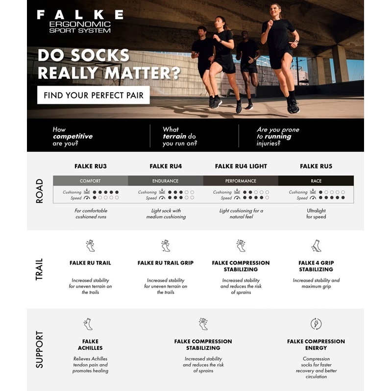 • skarpetki biegowe "FALKE RU Compression Stabilizing" stabilizują kostkę i w ten sposób zmniejszają ryzyko kontuzji