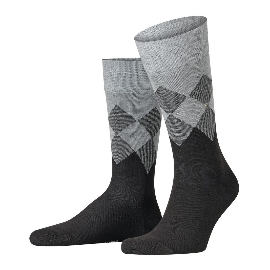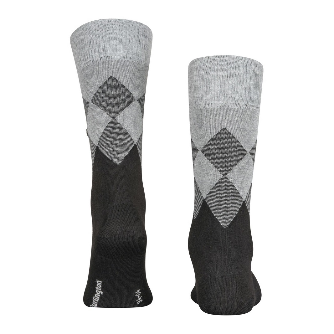 • skarpetka w klasycznym kolorze podstawowym, która przechodzi w typowy dla Burlington wzór Argyle, z łatwością