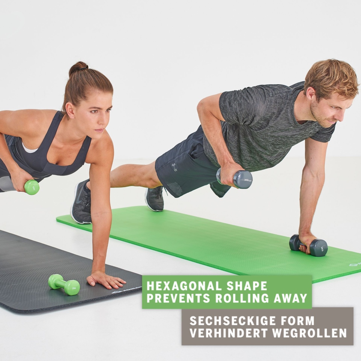 • dwa hantle winylowe - każda o wadze 0,5 kg. Dzięki rdzeniowi żeliwnemu i zielonemu pokryciu winylowemu są trwałe i wygodne w użyciu