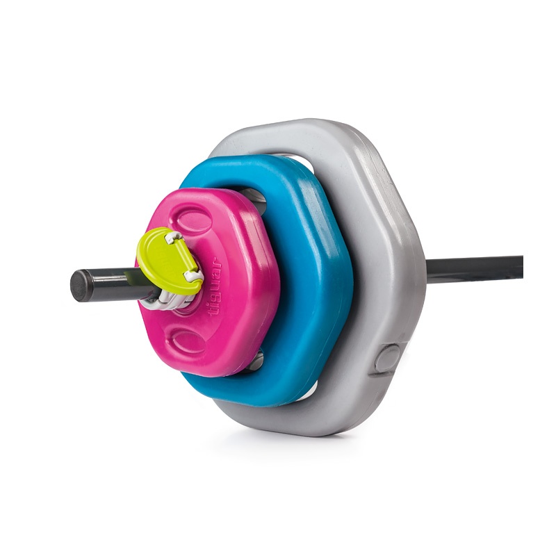• kompletny zestaw składa się z: 2x1.25 kg różowy, 2x2.5 kg niebieski, 2x4,5 kg szary