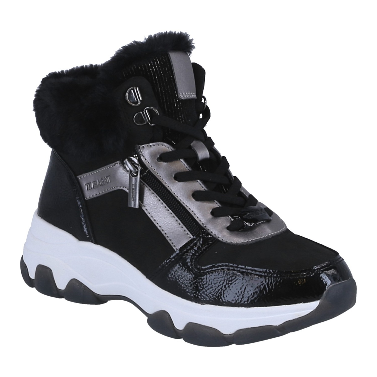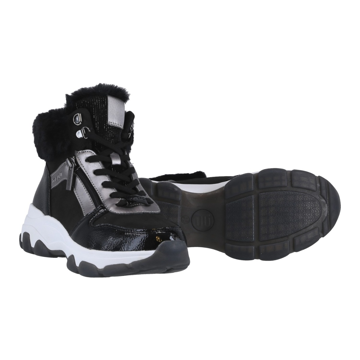 • Botki damskie wyposażone są w zewnętrzny fałszywy zamek błyskawiczny oraz sznurowanie