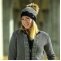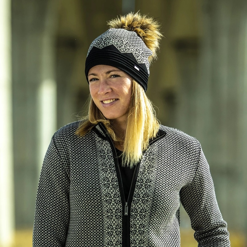 • czapka damska do miasta i na stok z podszewką z delikatnego materiału polarowego z filigranowym wzorem, uzupełniona dużym pomponem z sztucznego futra.