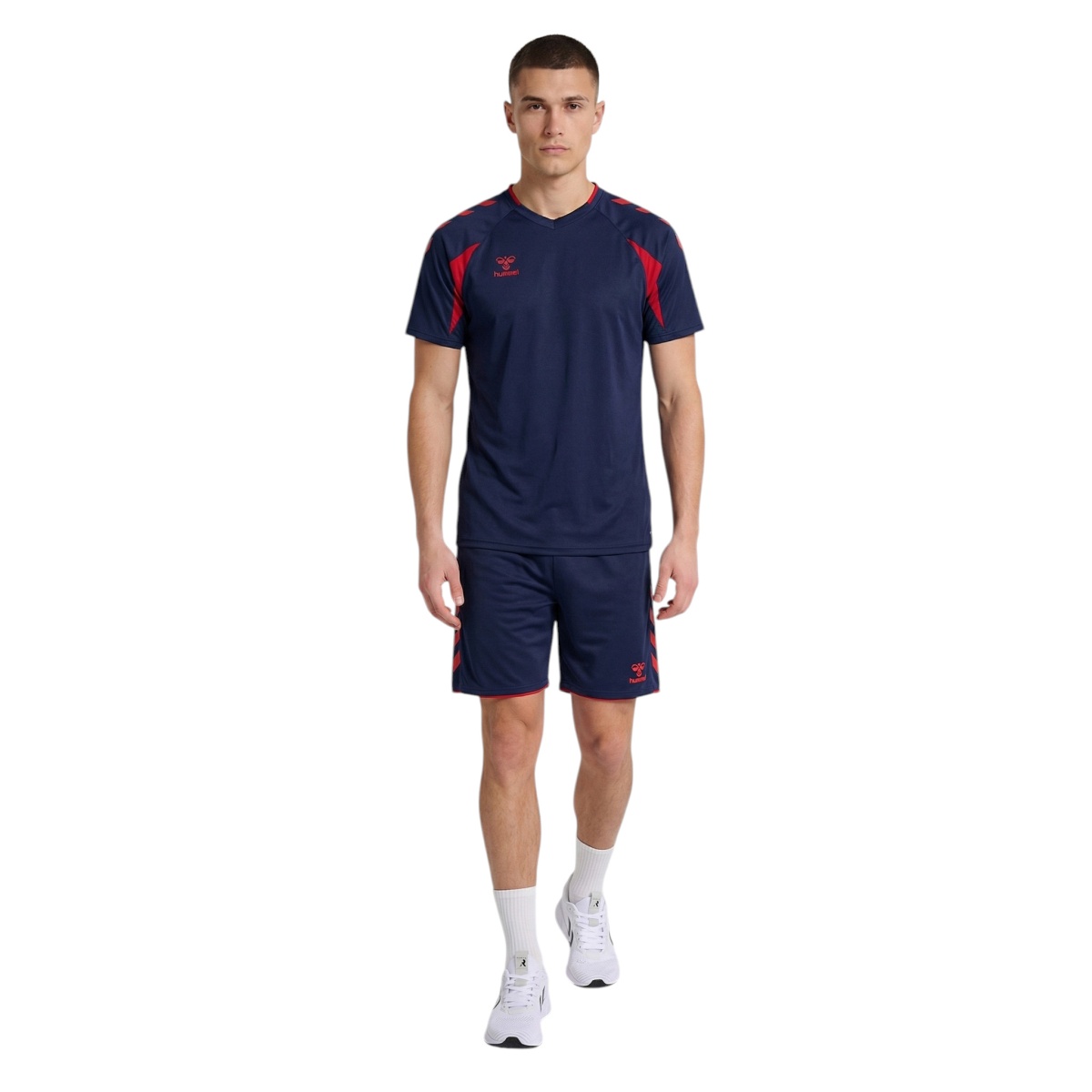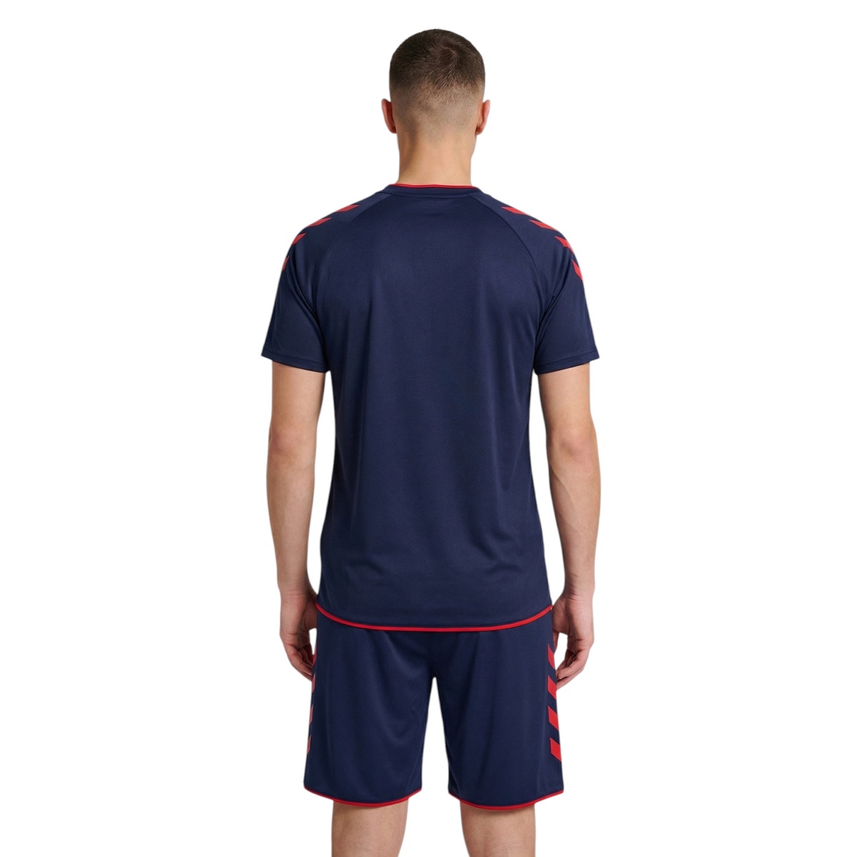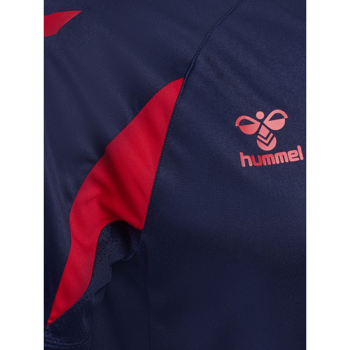 • koszulka ma rękawy raglanowe dla lepszej swobody ruchów, kontrastowe wstawki na ramionach oraz kultowe chevrony hummel na rękawach, które podkreślają sportowy wygląd drużynowy.