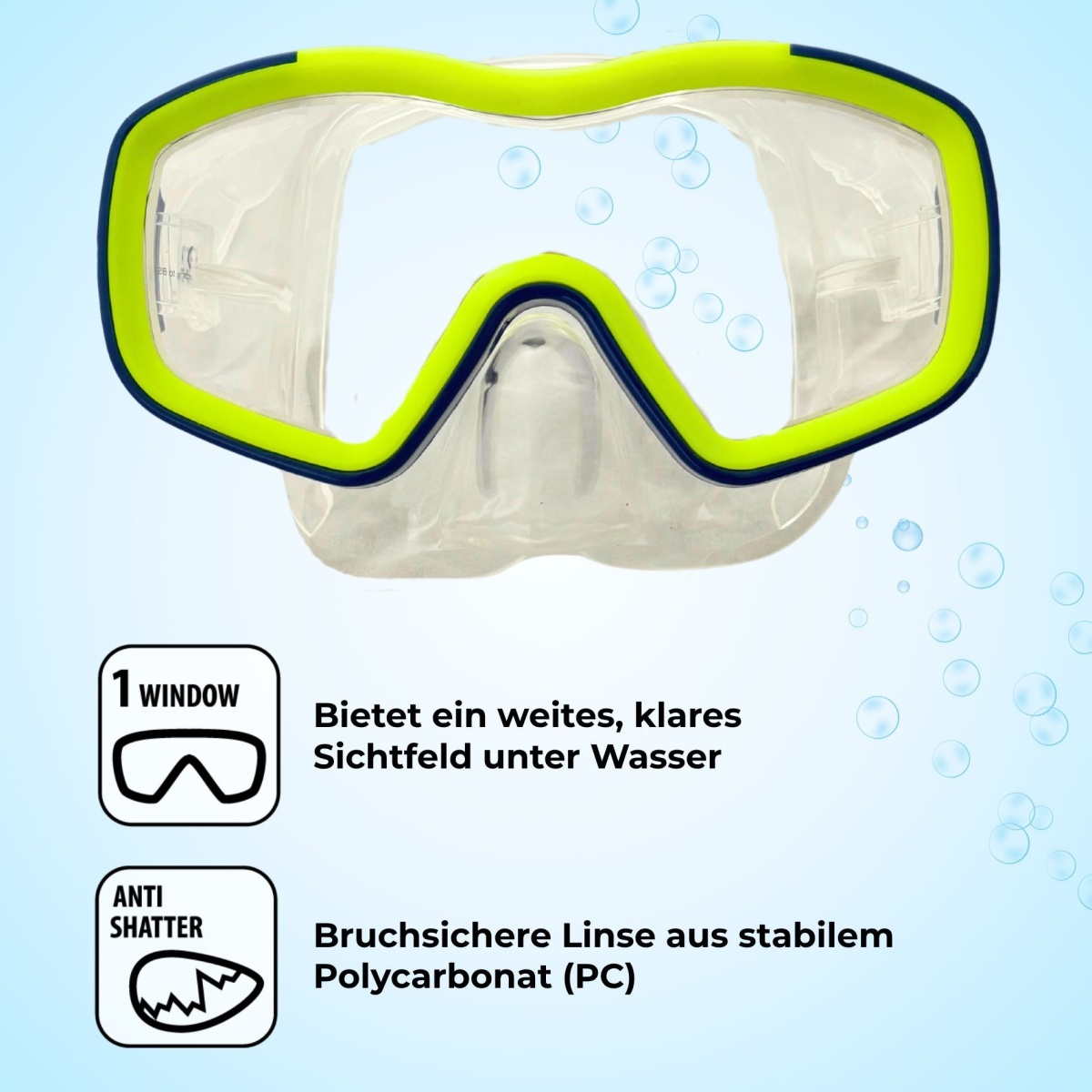 • Wyraźne widzenie i bezpieczeństwo – maska z pojedynczą szybą, odporna na stłuczenia, z wytrzymałego poliwęglanu (PC) dla szerokiego pola widzenia, chroni oczy i zapewnia wyraźny widok pod wodą