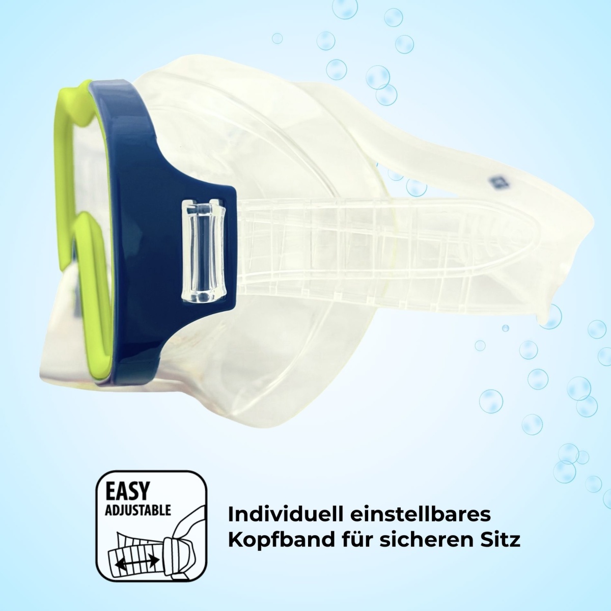 • Regulowany pasek na głowę – maska z miękkim, indywidualnie dopasowywanym paskiem na głowę dla pewnego dopasowania i komfortu noszenia – nie przesuwa się podczas nurkowania lub pluskania
