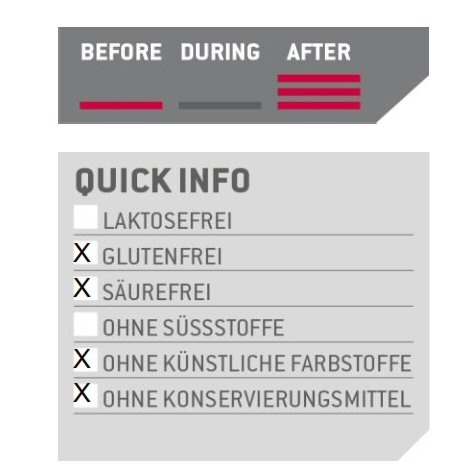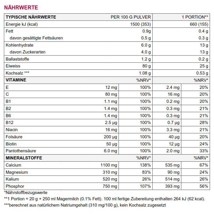 • Skład: Proszek białkowy 94% (białko mleczne z ultrafiltracji przepływu krzyżowego, białko serwatkowe z mikrofiltracji przepływu krzyżowego, albumina jajeczna), aromaty, L-leucyna 1%, węglan magnezu, substancje zagęszczające (mąka guarowa, ksantan), kwas cytrynowy, substancje słodzące (acesulfam K, neotam), witaminy (kwas askorbinowy, niacynamid, octan alfa-tokoferylu, pantotenian wapnia, chlorowodorek pirydoksyny, ryboflawina, mononitrat tiaminy, kwas foliowy, biotyna, cyjanokobalamina), przeciwutleniacz kwas askorbinowy. Tylko 4.0 g laktozy w 100 g