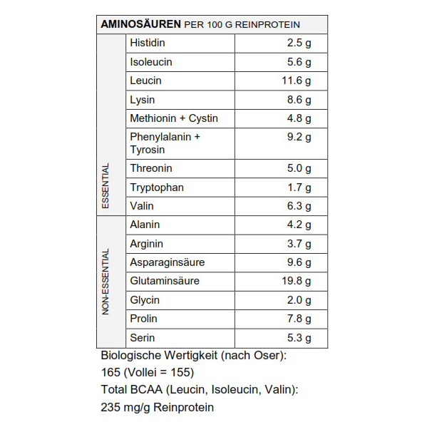 • Profil aminokwasowy o wysokiej zawartości aminokwasów egzogennych, w tym BCAA