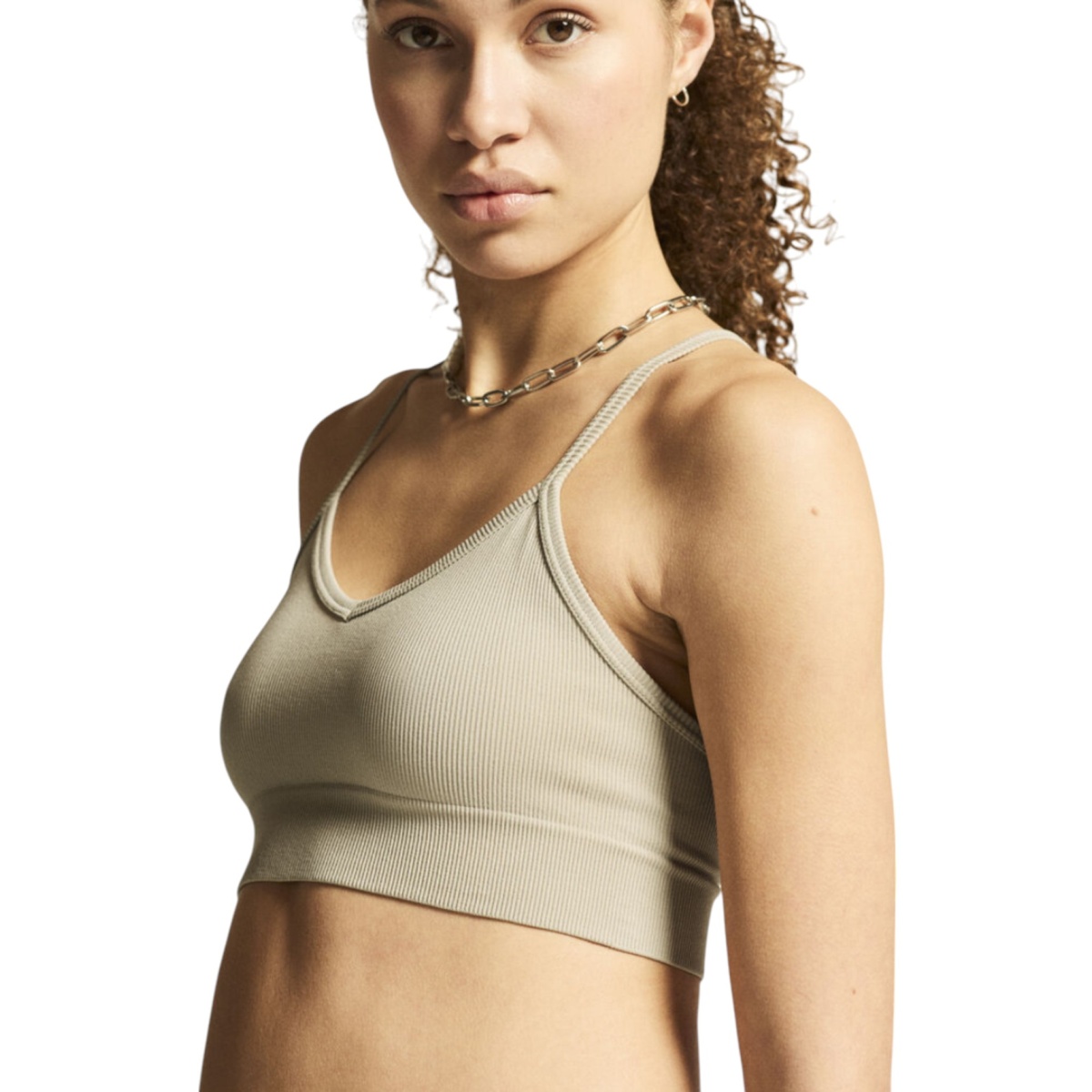 • Ten elastyczny biustonosz sportowy wykonany jest z miękkiego materiału stretchowego o prążkowanej strukturze i idealnie nadaje się do płynnego przejścia z treningu do codziennego życia.