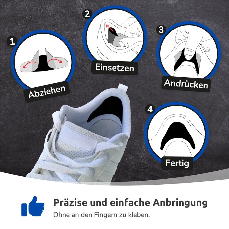 • szybka i łatwa w aplikacji: dzięki ergonomicznemu kształtowi łatki i podzielonej na pół folii ochronnej, łatka może być łatwo i intuicyjnie nałożona na piętę twojego buta