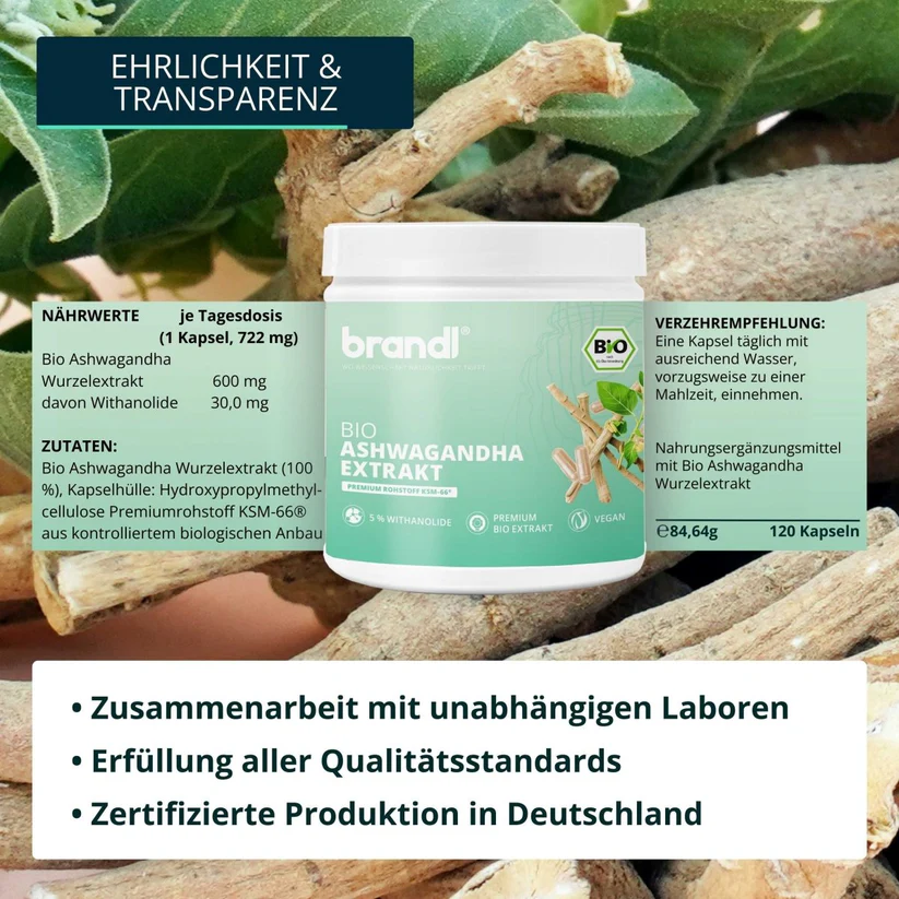• nasz ekstrakt premium dostarcza 600 mg czystego, bio-certyfikowanego ekstraktu Ashwagandha na kapsułkę, który jest napełniany w Niemczech zgodnie z najwyższymi standardami jakości